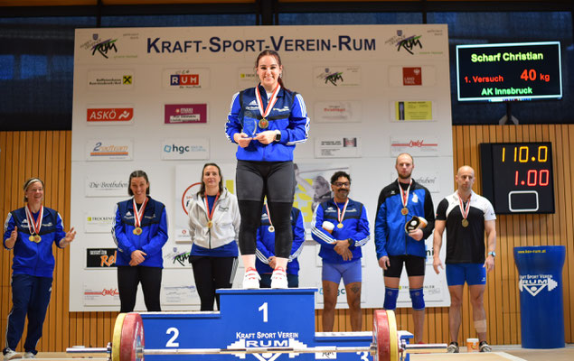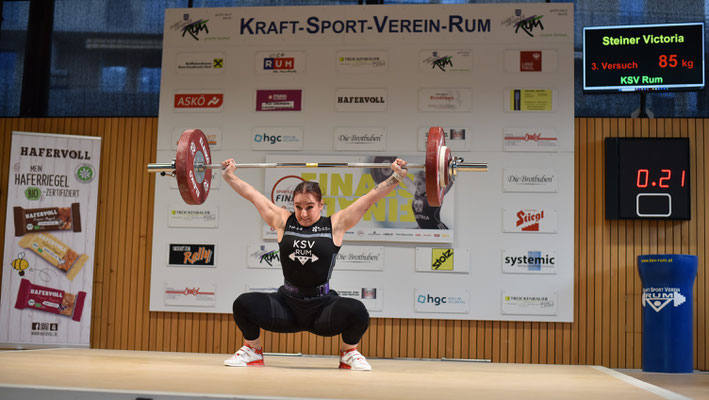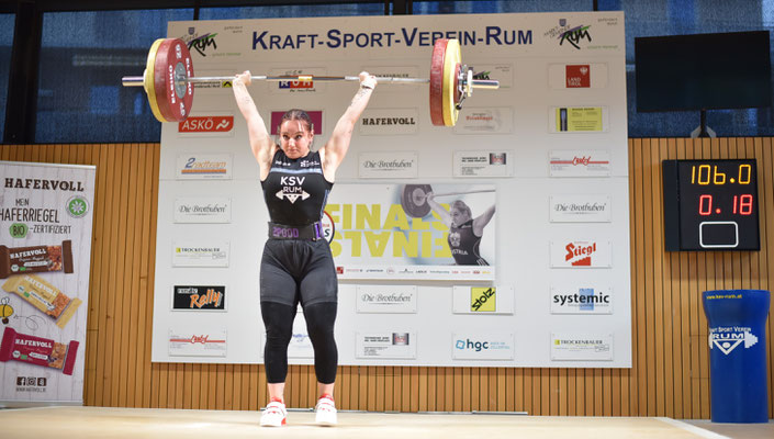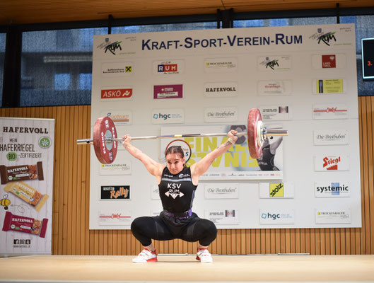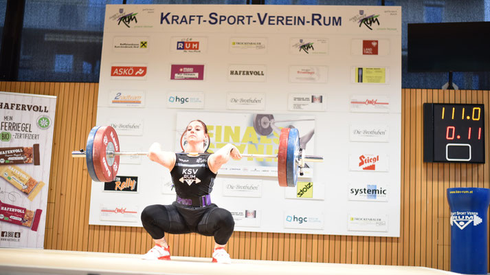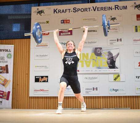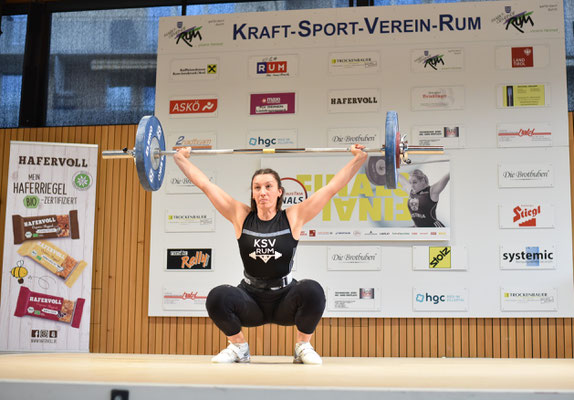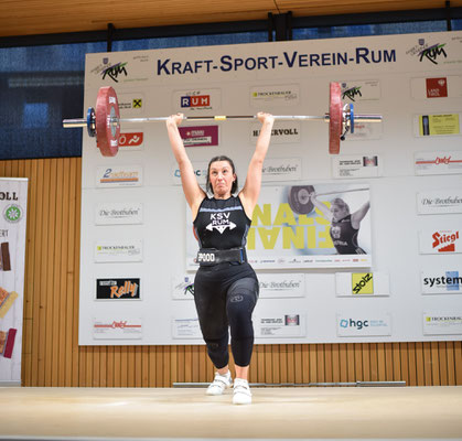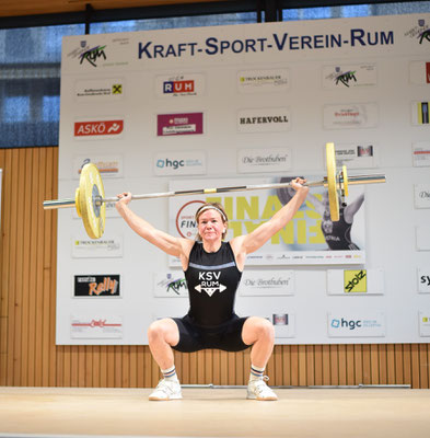 Mit 11 x GOLD und 1 x SILBER und 1 x BRONZE war der KSV-RUM der erfolgreichste Verein der Meisterschaft. Den Beginn machten unsere Girls. Britta Fürle war nach längerer Pause wieder an der Hantel und konnte mit 121 kg im Zweikampf den Titel der Kat. -64 erkämpfen. Ebenfalls einen super Wettkampf zeigte Tamara Norz welche mit 149 kg im Zweikampf die Goldmedaille in der Kat. -77 kg (Allgemeine Klasse und Masters) nach Rum holte. Die Highlights setzte dann Victoria Steiner in der Kat. -69 kg. Vici konnte mit 85 kg Reißen - 106 kg Stoßen und 191 kg im Zweikampf 3 neue Tiroler Rekorde der Allgemeinen Klasse aufstellen. Natürlich bedeutet dies den Titel in der U23 und der Allgemeinen Klasse. Somit zeigte sich Victoria 4 Wochen vor der U23-EM, welche in Albanien stattfindet, in ausgezeichneter Form. Fast schon selbstverständlich, dass Victoria damit die stärkste Athletin aller Frauen mit 241,19 Punkten war.