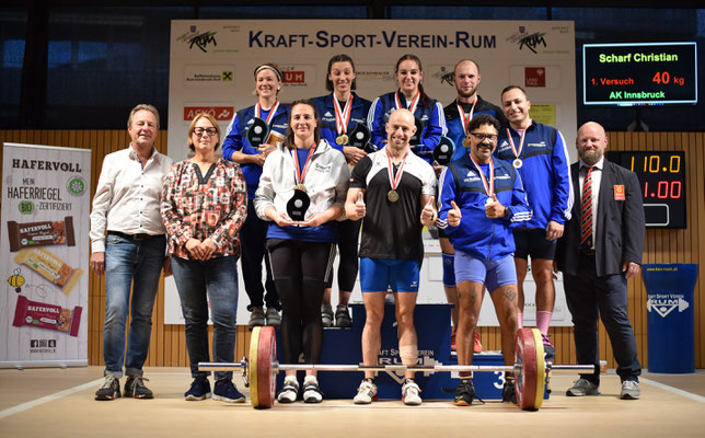 Für die Rumer Titel bei den Männern in der Allgemeinen Klasse sorgte Hubert Descher mit 225 kg im Zweikampf der Kat. -94 kg und Lukas Walkam mit 188 kg im Zweikampf der Kat. -110 kg.